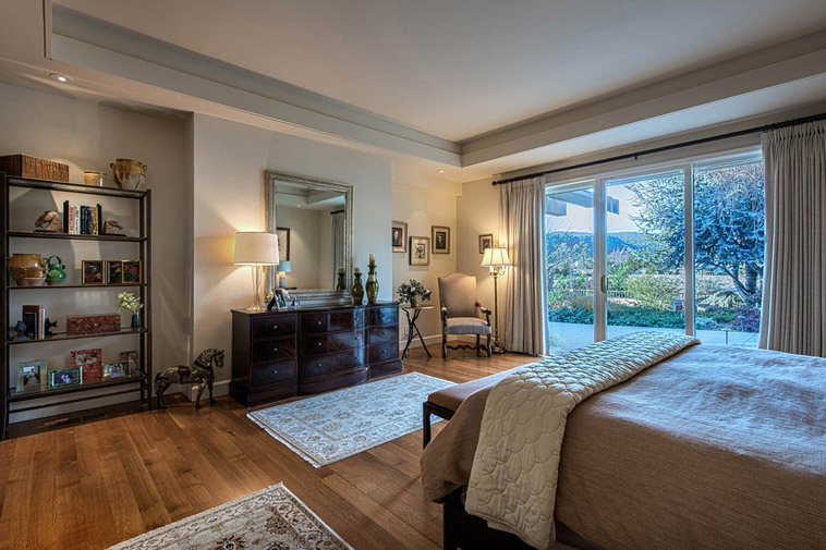 custom built-ins, raised, tray ceiling and cozy Carmel stone fireplace. Romantic and alluring